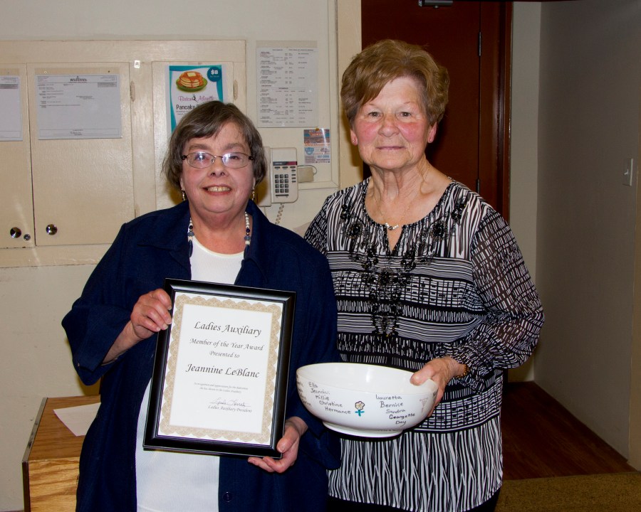 Ladies’ Auxiliary President, Lynda Laverty presents Auxiliary Member, Jeannine LeBlanc a 2017 Member of the Year Award.