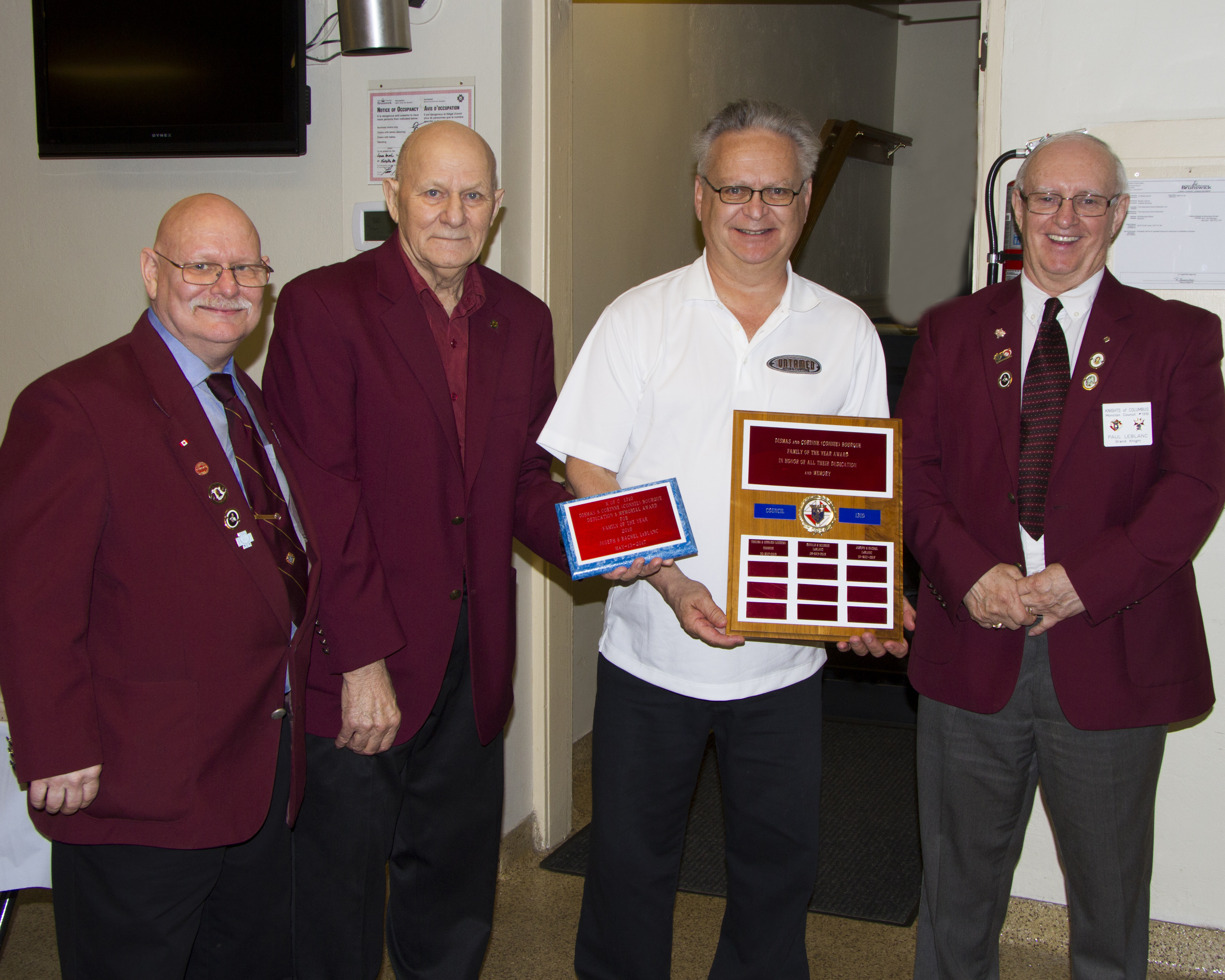Grand Knight, Paul LeBlanc, Trustee, Norman Gallant and Past Grand Knight, Dismas Bourque present the 2017 Dismas and Corinne (Connie) Bourque Family Award was presented to Brother Joe LeBlanc and his wife, Rachel. Accepting for Joe and Rachel is their son, Bruce.
