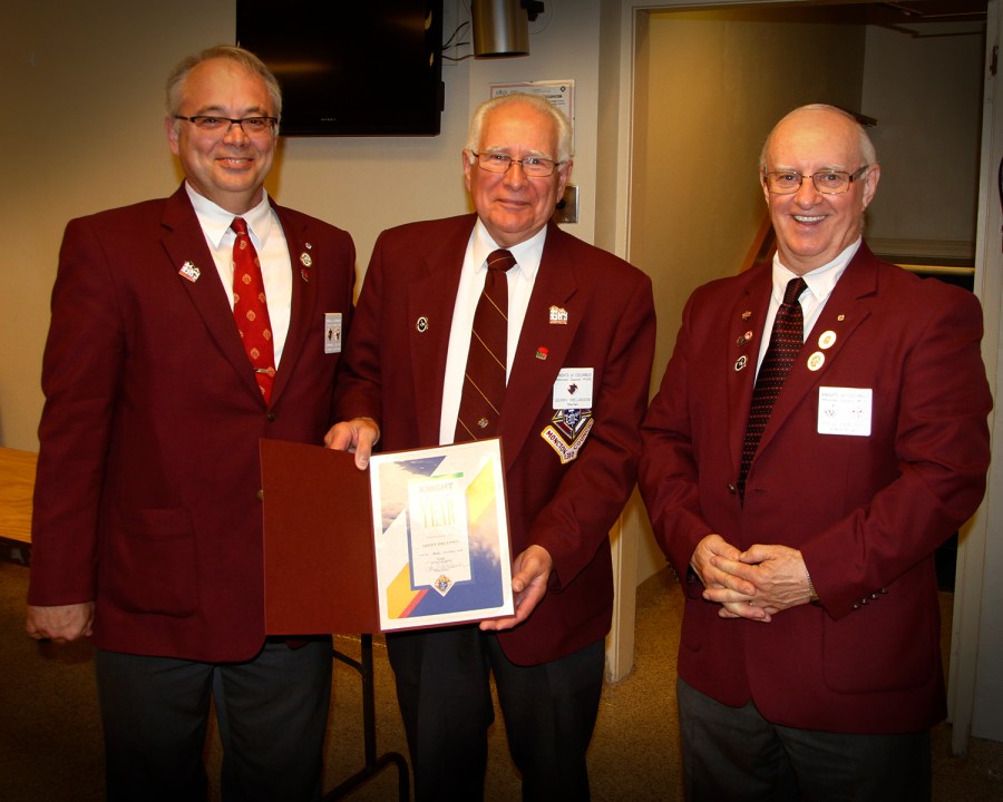 Gerry Melanson is presented with the 2016 Knight of the Year Award by Grand Knight Paul LeBlanc and Deputy Grand Knight, Gil Parent.