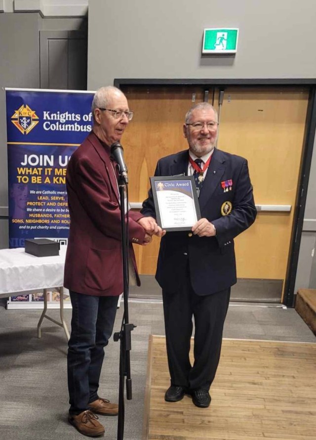 At the annual Knights of Columbus New Brunswick State Convention, Past Grand Knight and Fourth Degree Knight Leo Bordage accepted a Civic Award from the Supreme Council for patriotic service to our community.