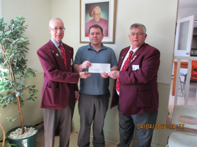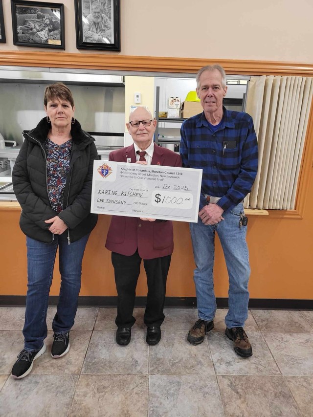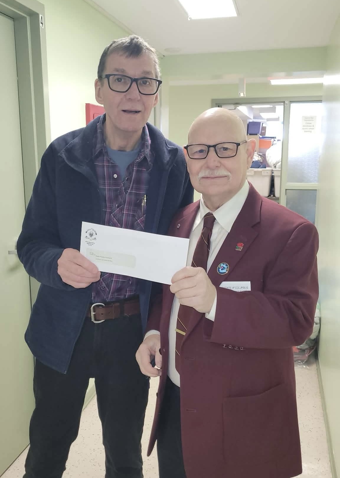 Recently, Grand Knight Norm Gallant and Deputy Grand Knight Bill Landry presented a cheque of $1,000 to Greg Fennell of the Ray of Hope Soup Kitchen.