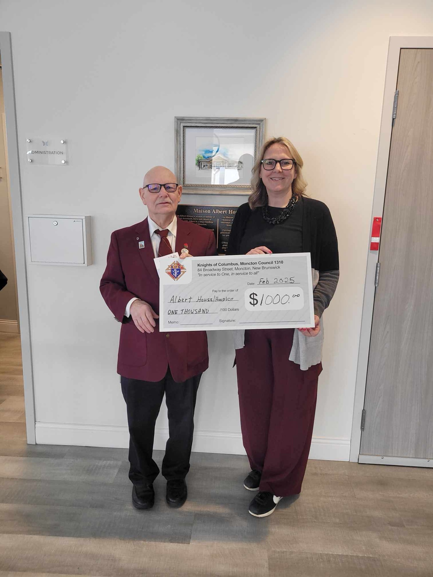 Recently, Grand Knight Norm Gallant presented a cheque for $1,000 to Frances LeBlanc of Maison Albert House (Hospice SENB). We’re happy to support an organization that contributes to the dignity of life.