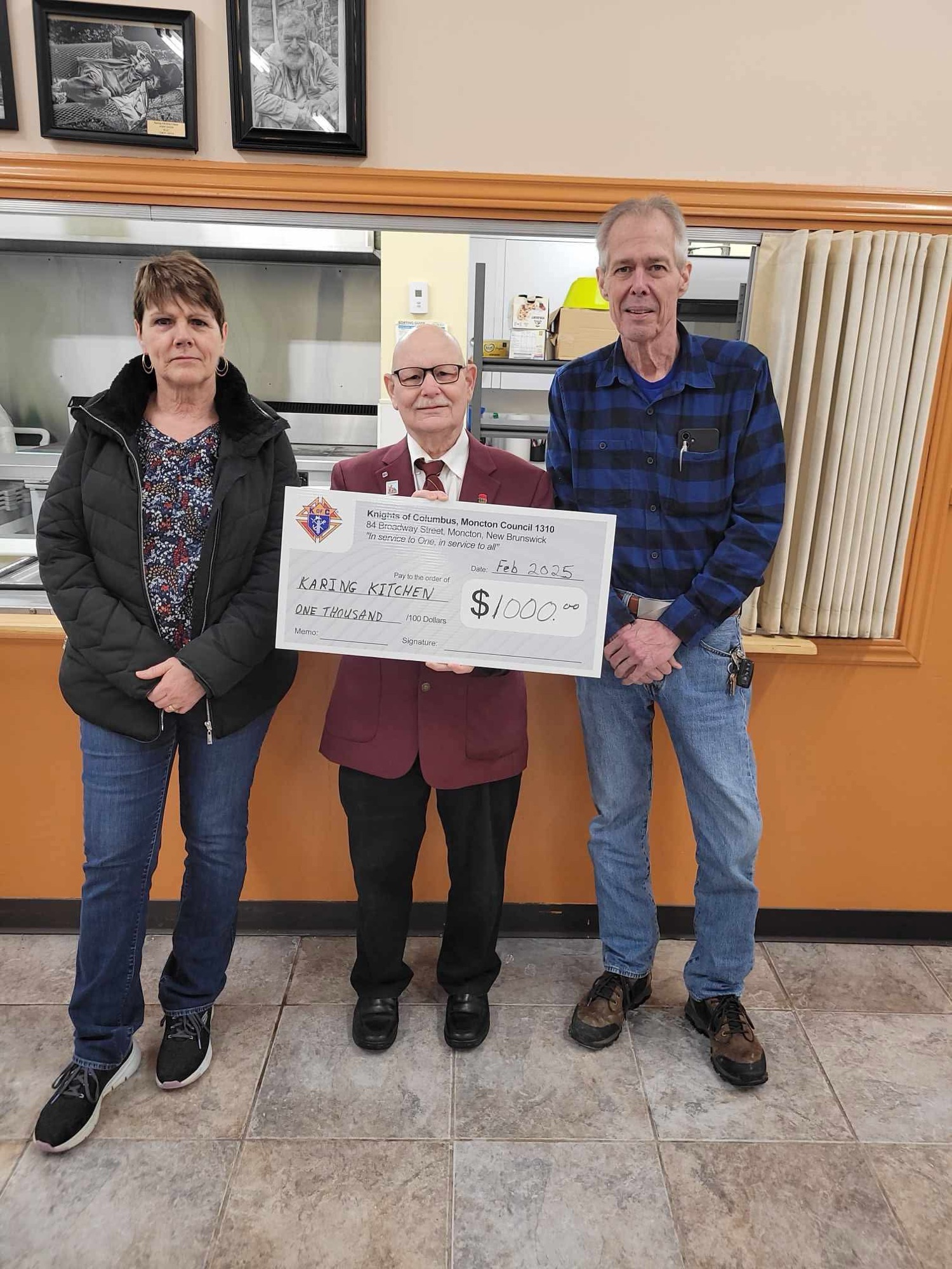 Recently, Grand Knight Norm Gallant presented a cheque for $500 to Bruce Lawson, the Executive Director of the Karing Kitchen. We are proud to serve our community!
