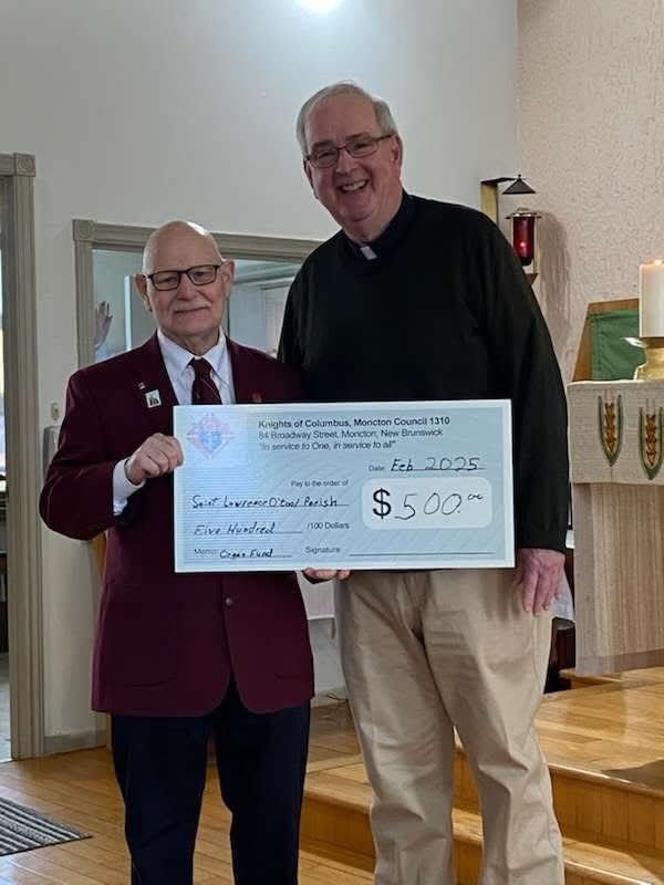 Recently, Grand Knight Norm Gallant presented a cheque for $500 to Father Angus Johnson, our Worthy Chaplain on behalf of Saint Lawrence O’Toole in the parish unit of Queen of All Saints Parish Grouping. The church recently obtained the organ from Our Lady of Calvary Monastery in Rogersville. Our donation went towards the purchase and installation of the organ.