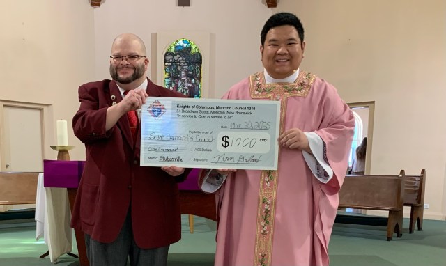 Recently, Grand Knight Norm Gallant presented a cheque of $1,000 to Father Carlos Jacinto to go towards their 2026 Marriage Enrichment Retreat.