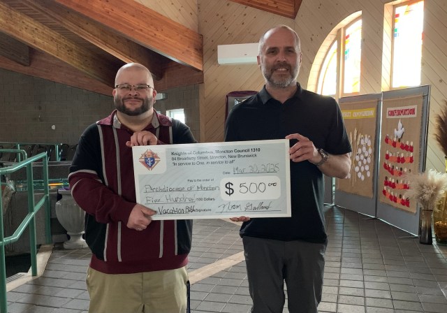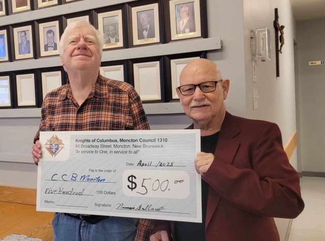 Recently, Grand Knight Norm Gallant presented a cheque of $500 to New Brunswick Right to Life to help with their Soup for Life event this weekend at Saint Bernard’s. Accepting the cheque was Lise Watts, president of the New Brunswick Right to Life, Moncton Chapter.