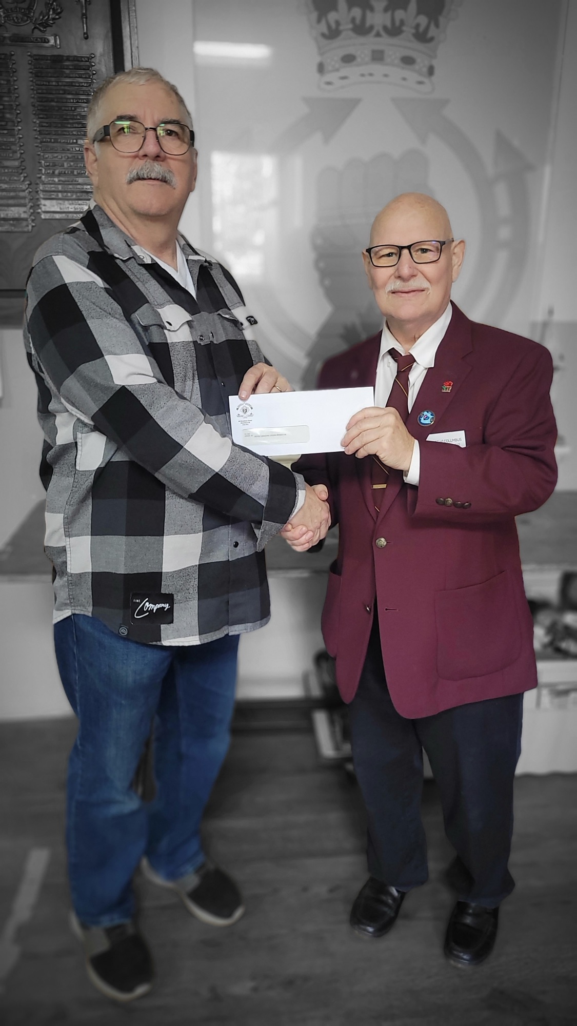 On November 11, Grand Knight Norm Gallant presented a cheque of $300 to the Sunny Brae Legion for the annual Poppy Campaign. Accepting on behalf of the Legion is Poppy Campaign Chairman Bill Fallon.