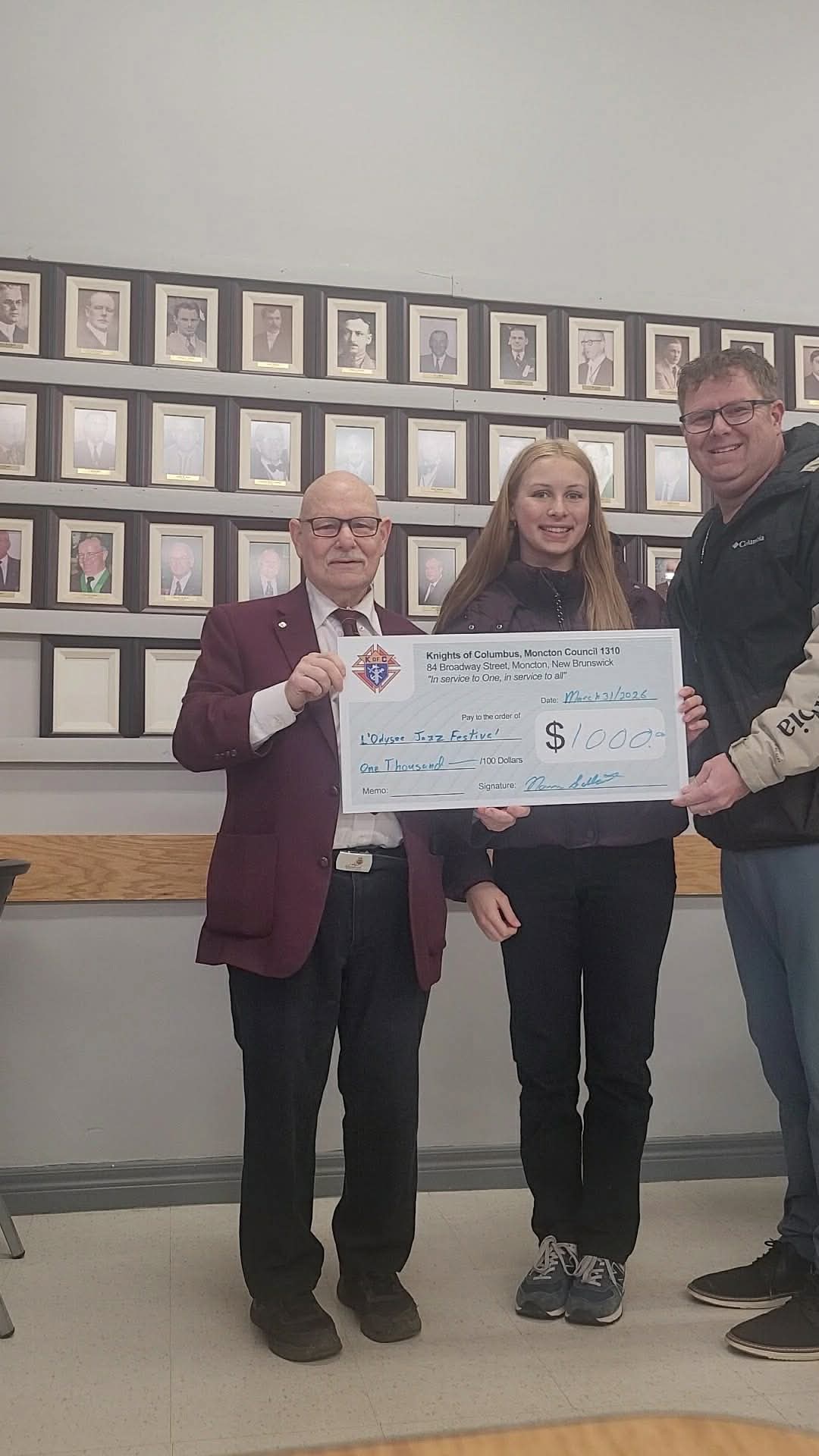 Recently, Grand Knight Norm Gallant presented a $1,000 cheque to L’odysee High School Harmonie and Jazz on behalf of Shawn and Kelyane Amberman. We are delighted to help young people in our Community!