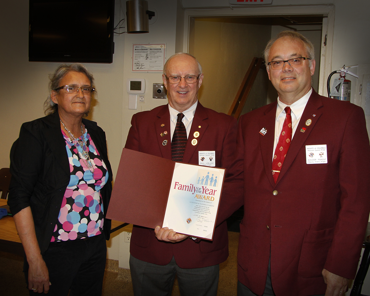 - Grand Knight, Paul LeBlanc and Trustee, Norman Gallant present Gerry Melanson with the 2016 Volunteer of the Year Award.