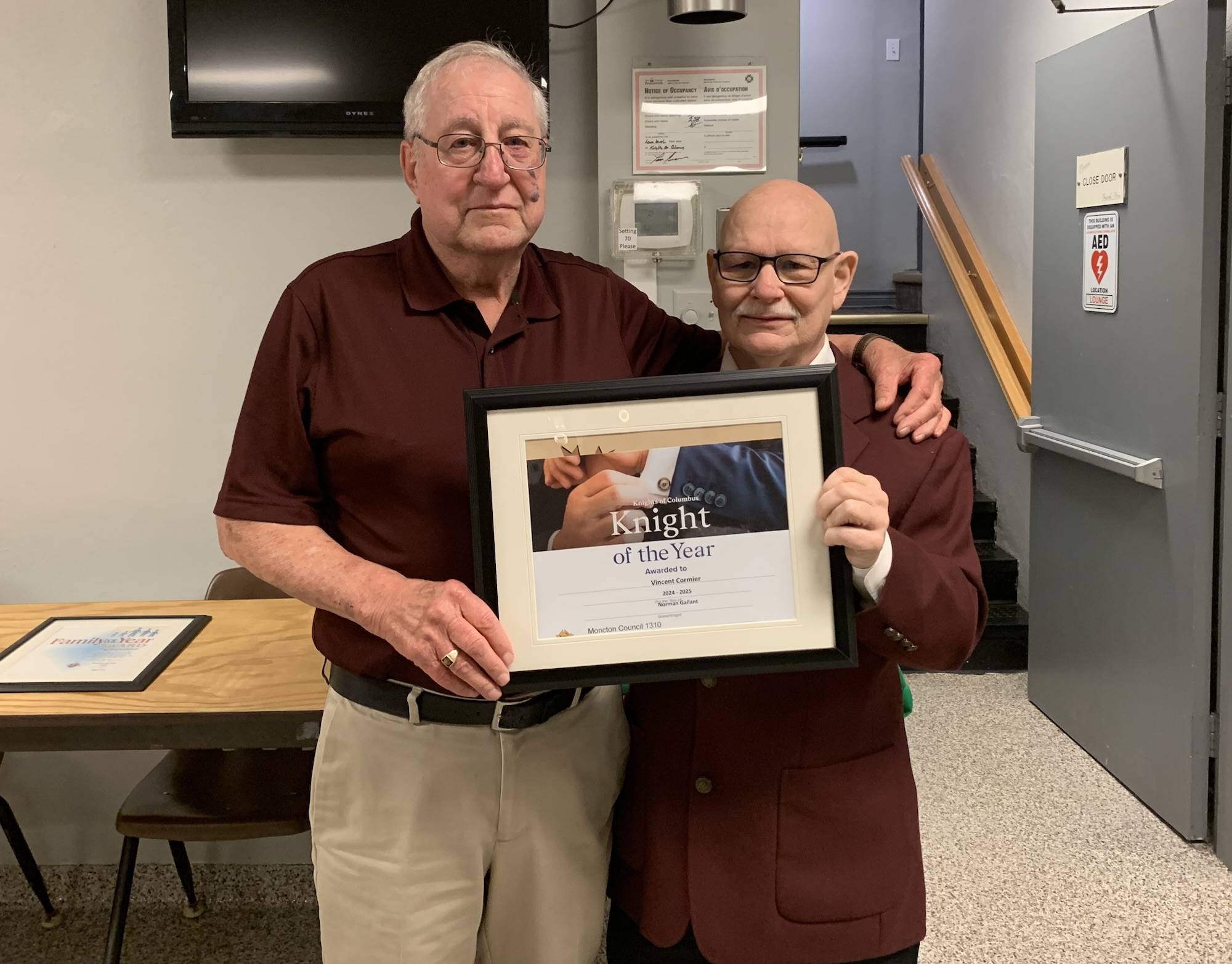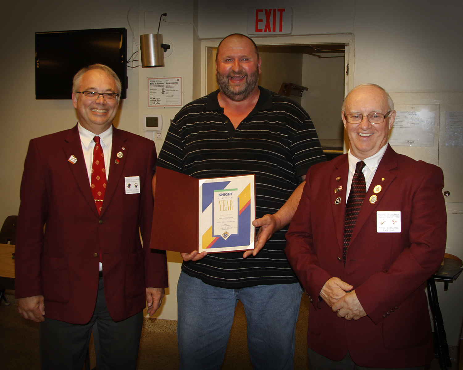 - Alyre Cormier is presented with the 2015 Knight of the Year Award by Grand Knight Paul LeBlanc and Deputy Grand Knight, Gil Parent.