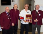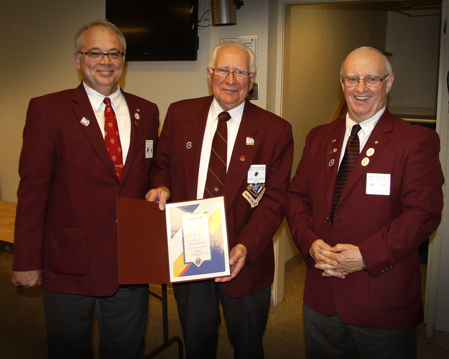 - Gerry Melanson is presented with the 2016 Knight of the Year Award by Grand Knight Paul LeBlanc and Deputy Grand Knight, Gil Parent.