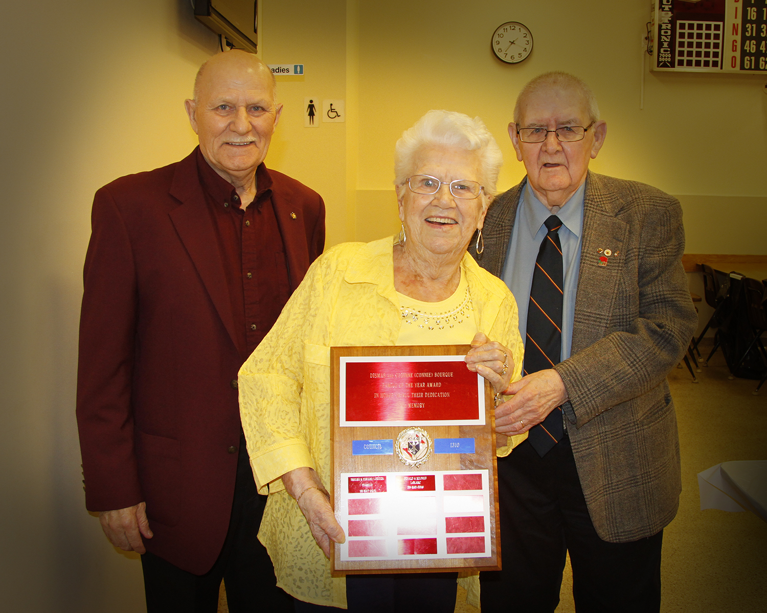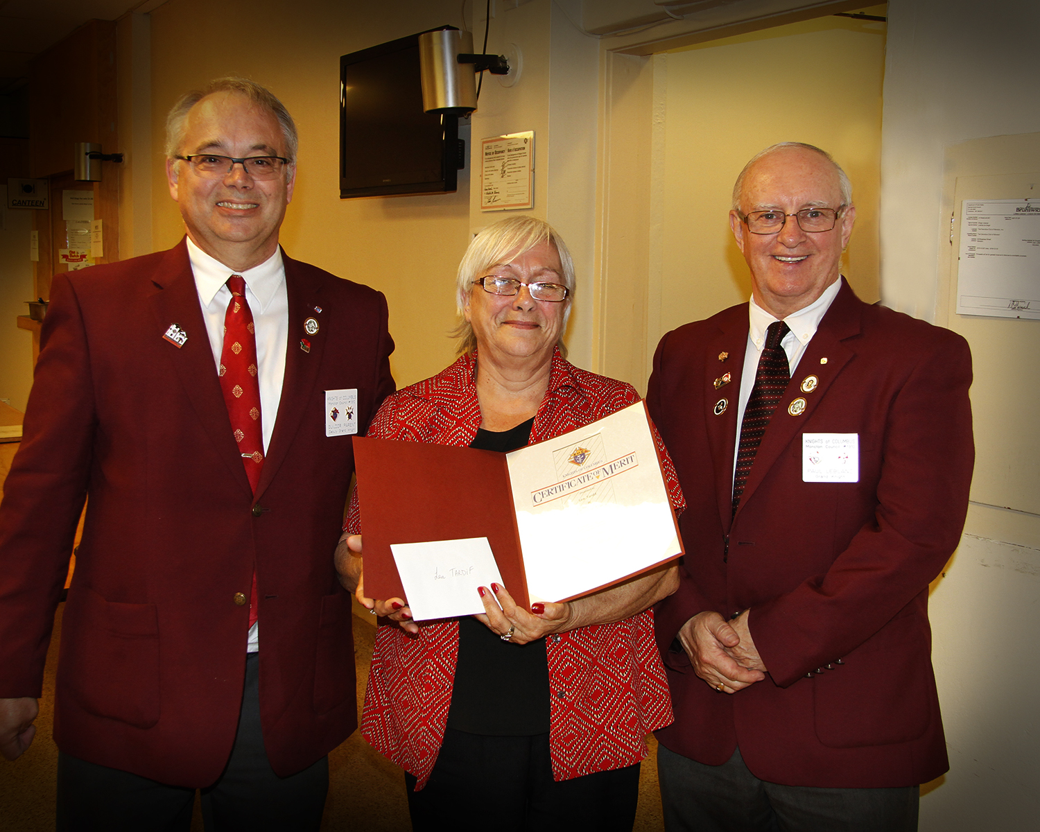 - Lea Tardif is presented with an Award of Merit by Grand Knight, Paul LeBlanc and Deputy Grand Knight, Gil Parent.