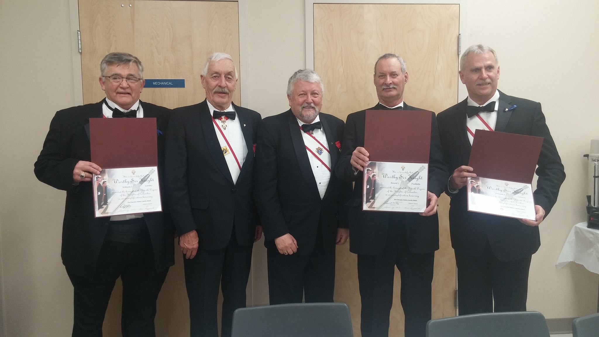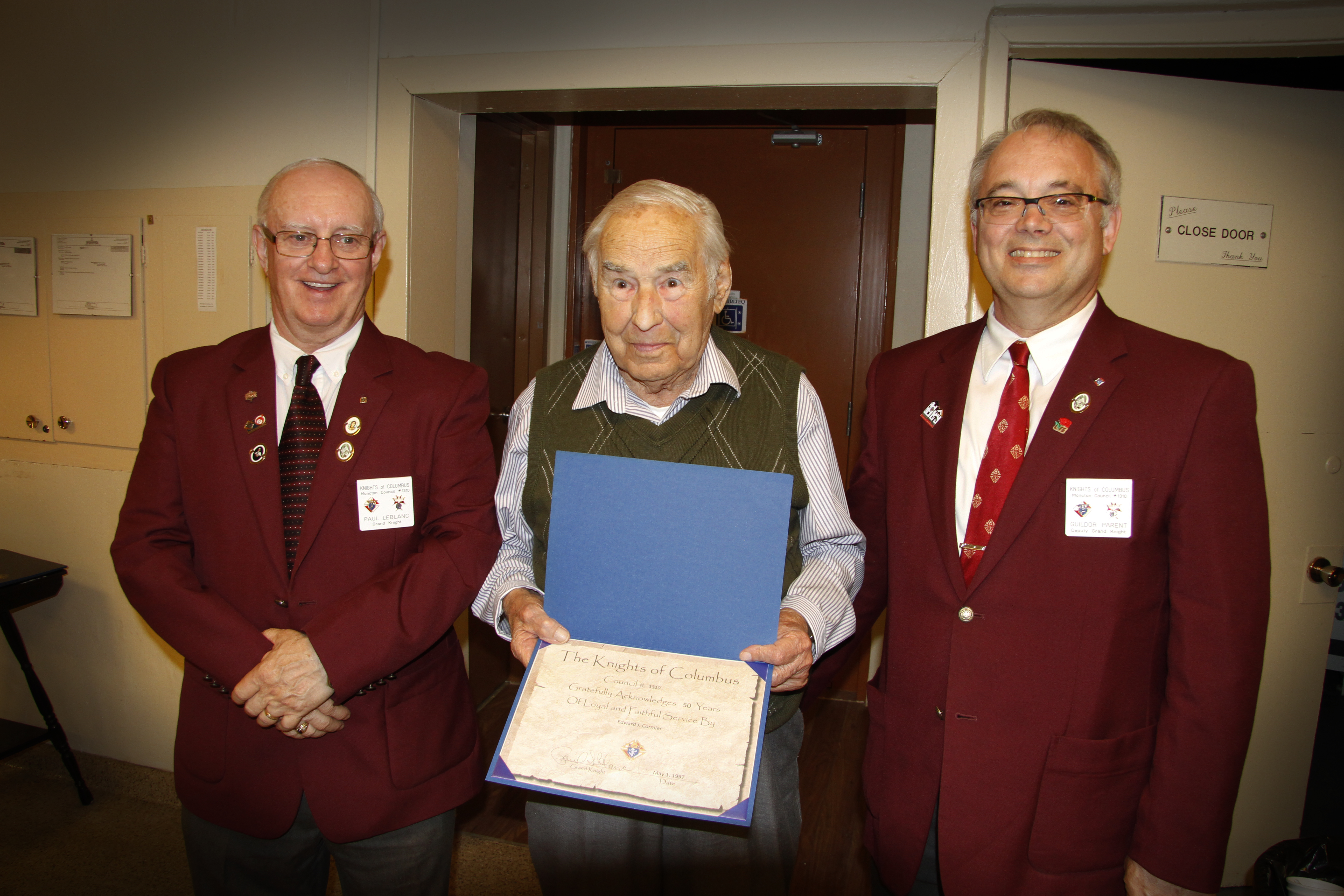 - Brother Édouard “Jigger” Cormier is presented with a Fifty Year Plus Membership Certificate by Grand Knight Paul LeBlanc and Deputy Grand Knight, Gil Parent.